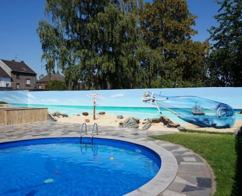 Gestaltung einer langen Außenwand mit einem Strandmotiv der Karibik und einem kunstvollen Illusionsgemälde mit Flaschenpost
