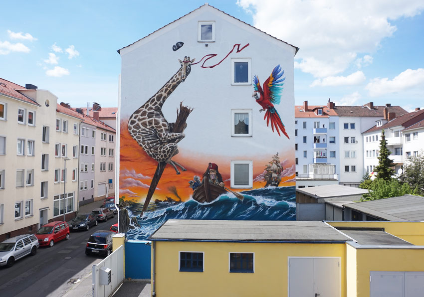 Auch Fassaden und Giebel können mit Graffiti kunstvoll bemalt werden. Hier nutze ich meist die Mischtechnik mit der Kombination aus Sprühdose und der Airbrush-Pistole.
